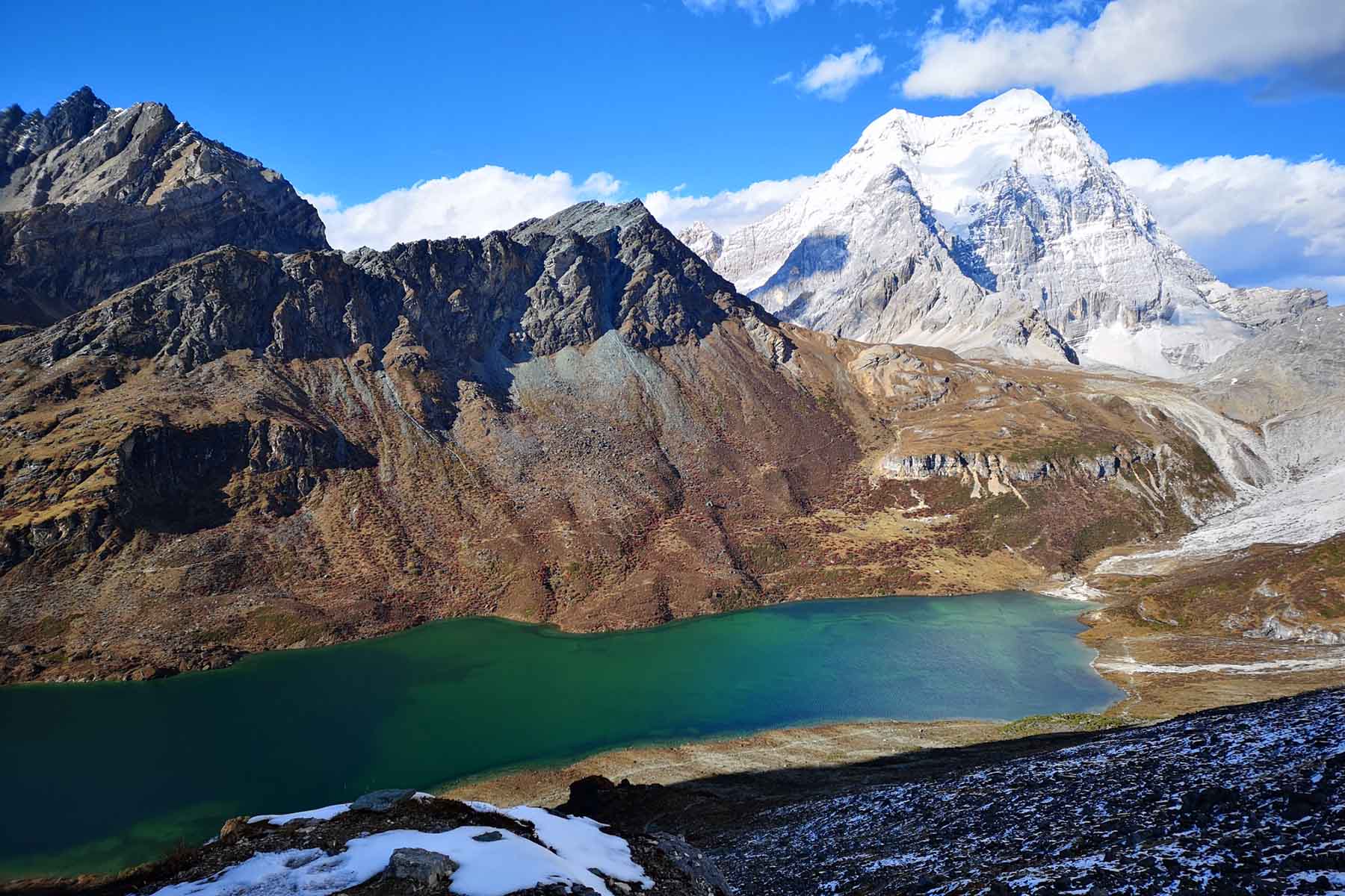 The walking up is very steep all the way to the lake from 4000m to 4700m in the distance of around 8km total single way. From around 4400m by half way we should be above the tree line and the views open up and we shall see the splendid view of the valley of Chonggu and Mt. Jampayang. Today’s walking is flexible and views are overall similar from around 4400m all the way to 4700m if one can not reach the lake. We will have a long stop by the lake after arrival and walk back the same way. We may need to start early in the morning for committed photographer. For more active hikers we may even go higher to the 4900m Chenardorje Pass for another 4km if time and weather allows. This is the most difficult day of hiking. And you are recommended to start early today and try to catch the first bus down to the start.