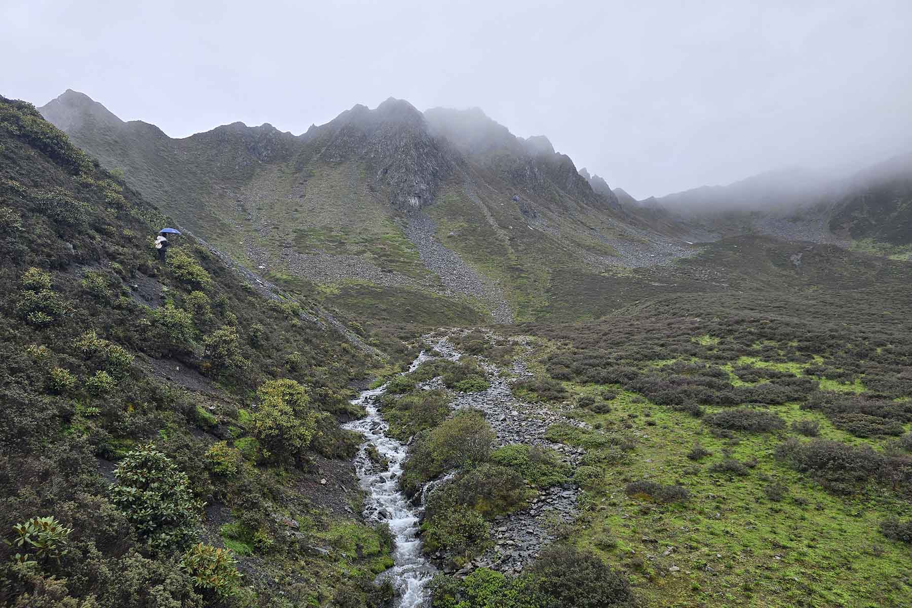 Wake up in the fresh air and usually with some fog or cloud by above the camp. Our camp is next to a small river and forests in the river valley. Feel free to walk around the camp before breakfast if weather is good. We will have breakfast in the natural environment and pack up and walk up the river valley following the track next to the river.